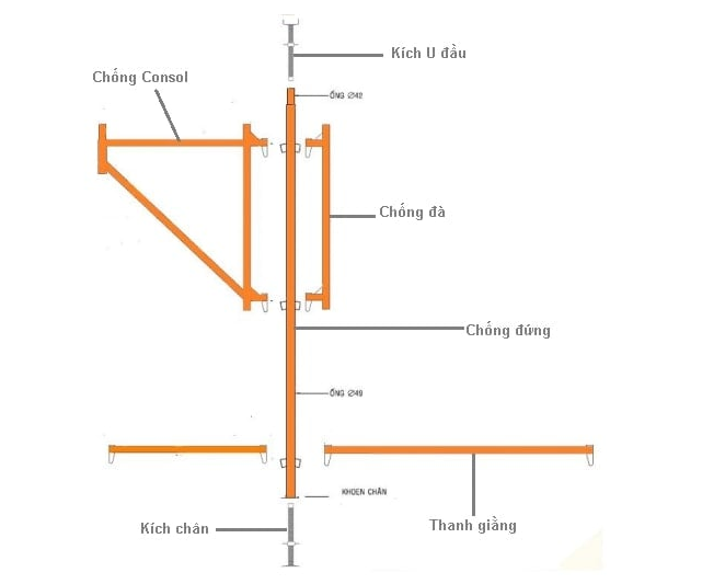 – Hệ giàn giáo nêm về cơ bản gồm có các bộ phận như sau: thanh giằng nêm, thanh chống đà, thanh chống consol, cây chống đứng (có đầu nối hoặc không đầu), chống xiên, kích u, kích chân, ống nối giáo…