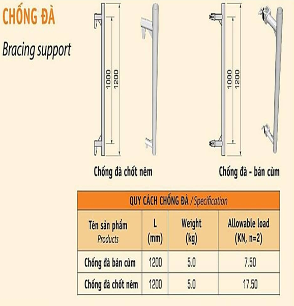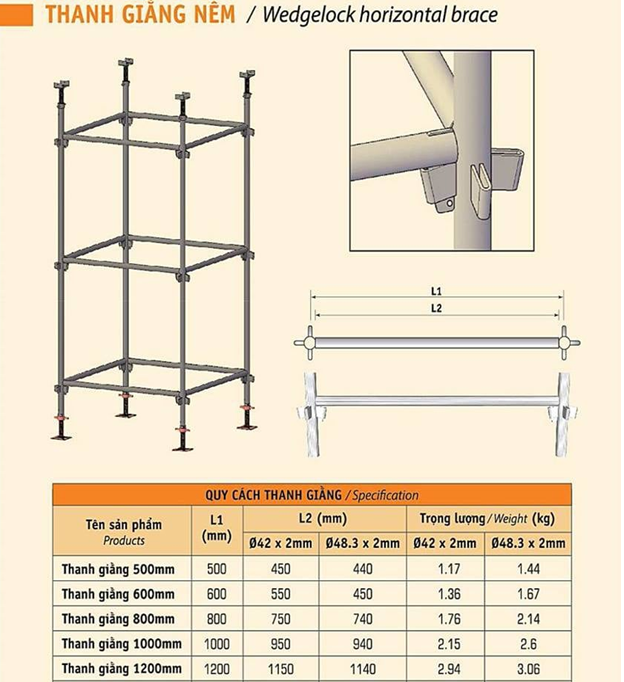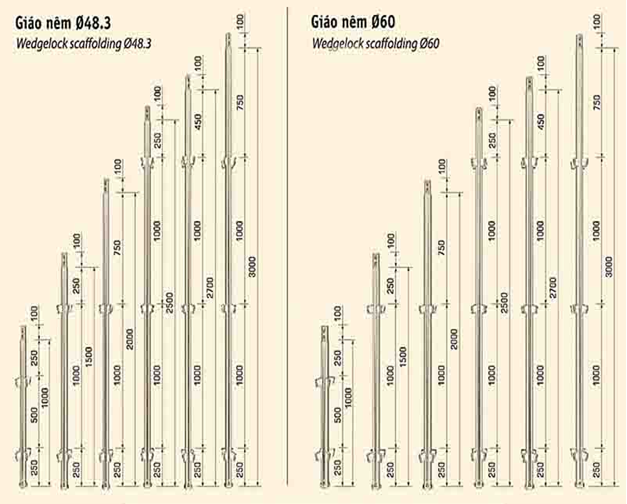 – Hệ giàn giáo nêm Ø42, giáo nêm Ø60 các có thông số kỹ thuật phổ biến, kích thước khá đa dạng.